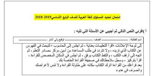 امتحان تحديد المستوى لغة عربية للصف الرابع الفصل الأول 2018 2019