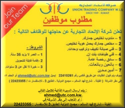 7 تخصصات مطلوبة للعمل بشركة الاتحاد التجارية الكويتية 22 3 2018 كويت شير