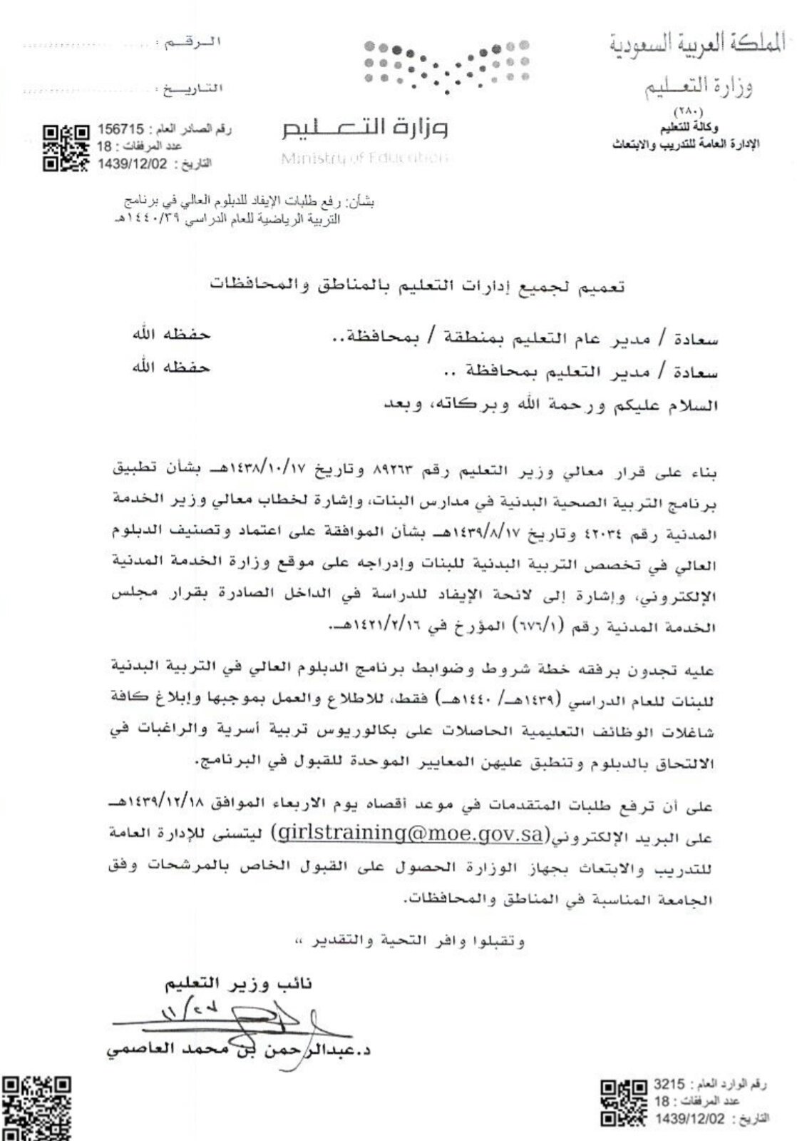 طالبت وزارة التعليم جميع إداراتها في المناطق والمحافظات برفع طلبات الإيفاد للدبلوم العالي في برنامج التربية الرياضية للعام الدراسي 1440 1439هـ.