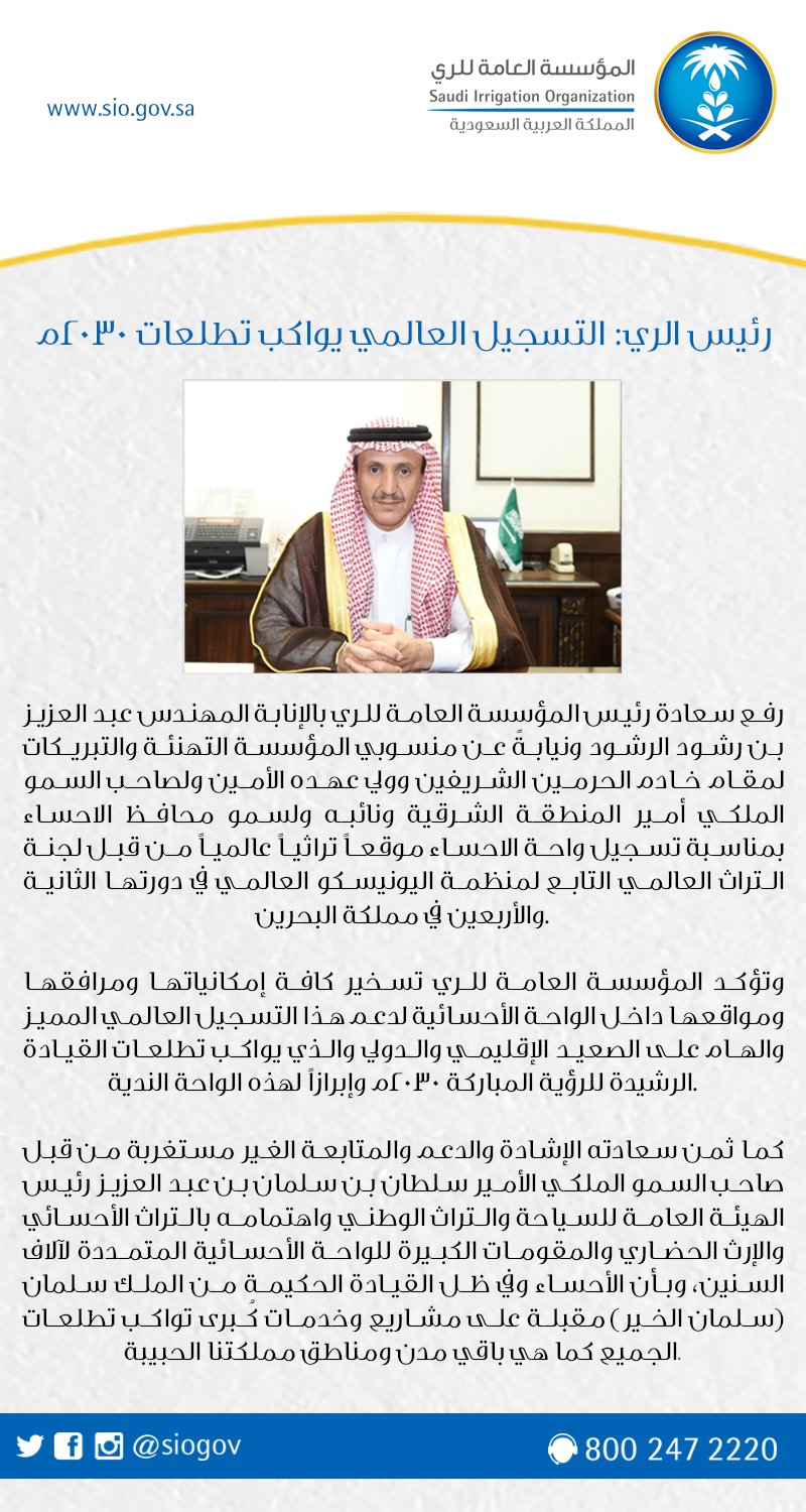 المؤسسة العامة للري بالاحساء. المؤسسة العامة للري تحصل على شهادتي الاعتماد الدولي الآيزو حققت المؤسسة العامة للري انجازا جديد ا بحصول. دبلوم في المختبرات البيئة أو ما يعادلهم مع القدرة على العمل بنظام الورديات وتقديم درجة اختبار. انطلقت صباح يوم الأربعاء 19 صفر 1439هـ مبادرة تشجير غابة جواثا في المنتزه الوطني بالشركة بين المؤسسة العامة للري مع وك. إعلان عن مزايدة بعروض مغلقة لبيع ثمار النخيل بفرع المؤسسة بالأفلاج استبيان ما مدى رضاك عن الخدمات الالكترونية للمؤسسة.