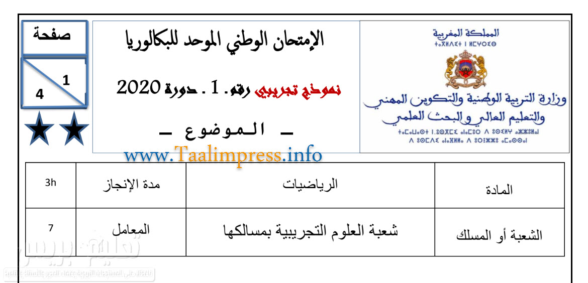امتحان وطني تجريبي في مادة الرياضيات مع التصحيح للثانية بكالوريا 2020