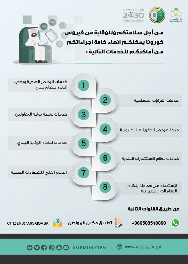 أمانة منطقة عسير على تويتر من أجل سلامتكم وللوقاية من فيروس كورونا يمكنكم إنهاء كافة إجراءاتكم من أماكنكم بالتواصل معنا عبر الخدمات التالية أمانة منطقة عسير عسير Https T Co Lttbgnv4ju