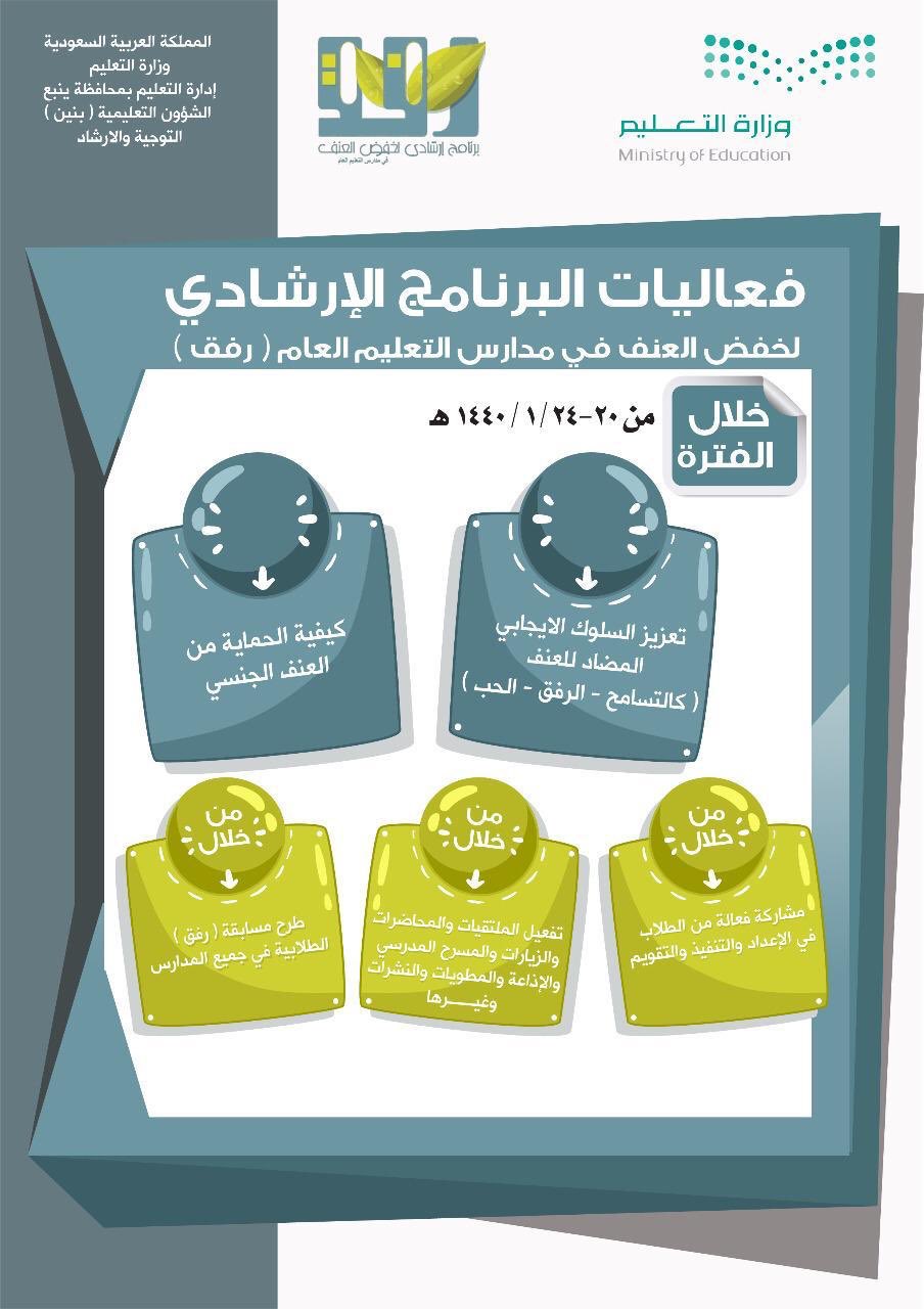 اعداد الطالبة وداد بوغراره الثانوية العاشرة. وقال البركاتي في كلمة بهذه المناسبة يهدف برنامج رفق إلى بناء الشخصية المتزنة السوية المتكاملة للطالب لخدمة الدين والمجتمع والوطن والحد من مشكلة العنف في المدارس وتوضيح الطرق الملائمة. برنامج رفق من الاسم فقط يمكنك أن تعرف على ماذا يدل ولما يدعو هذا البرنامج الذي يحارب العنف بكل أساليبه والذي انتشر في الآونة الأخيرة بين الطلبة والطالبات بل وزاد الأمر لوقوع حوادث عنف بين الطلاب والمعلمين الأمر.