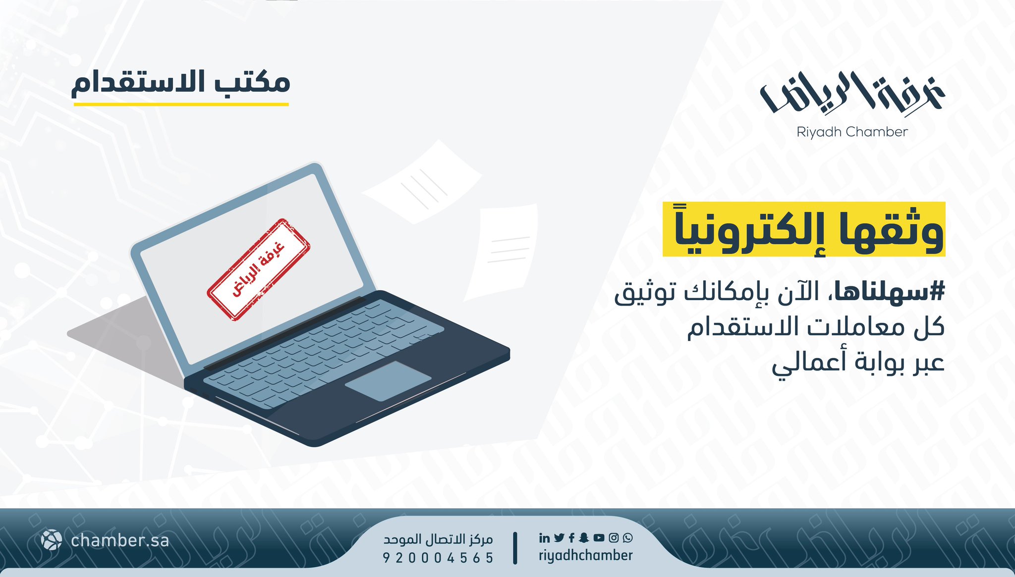 نقدم مجموعة خدمات لتصديق الوثائق والتصاريح ويمكنك انشاء عضوية لمتابعة الخدمات الالكترونية. الموظف المختص بقسم الخدمات التجارية والتصدبق الإلكتروني عن طريق الرقم الموحد 920024200 عن طريق البريد الإلكتروني info jcci org sa. فيلم تعريفي للخدمات الالكترونية التى تقدمها الغرفة التجارية الصناعية بالرياض ممثله في بوابة اعمالى وطريقة. البوابة الداخلية لموظفي الغرفة.