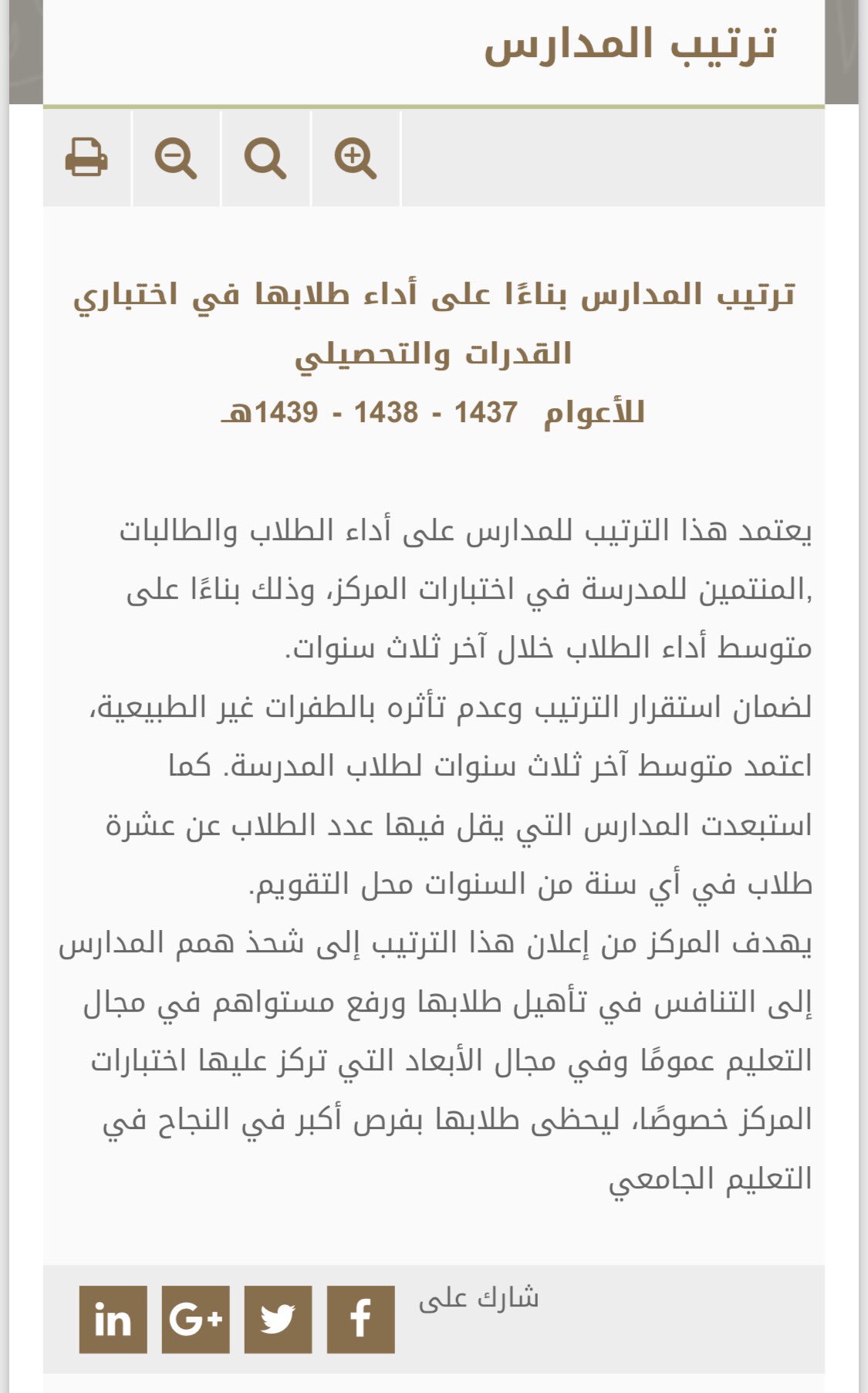 ترتيب المدارس في القدرات. كيفية فتح حساب جديد التسجيل في اختبار ورقي أو محوسب وكثير من العمليات الأخرى بمشاهدة العرض التوضيحي. أعلن المركز الوطني للقياس والتقويم ترتيب المدارس الثانوية للبنين والبنات بناءا على متوسط أداء طلابها لاختبار القدرات العامة واختبار التحصيل الدراسي للأعوام الثلاثة 1430 1431 1432 وذلك عبر موقع المركز على هذا الرابط. أعلن المركز الوطني للقياس التابع لهيئة تقويم التعليم عن ترتيب المدارس الثانوية بالمملكة وذلك بناء على نتائج الطلاب والطالبات في اختباري القدرات العامة والتحصيل الدراسي خلال ثلاث السنوات الماضية. أعلن المركز عن ترتيب المدارس بناء على الاختبارات التي يقدمها وأوضح مدير إدارة العلاقات والإعلام والاتصال إبراهيم بن محمد الرشيد أن المركز أنهى ترتيب مدارس المرحلة الثانوية للبنين والبنات.