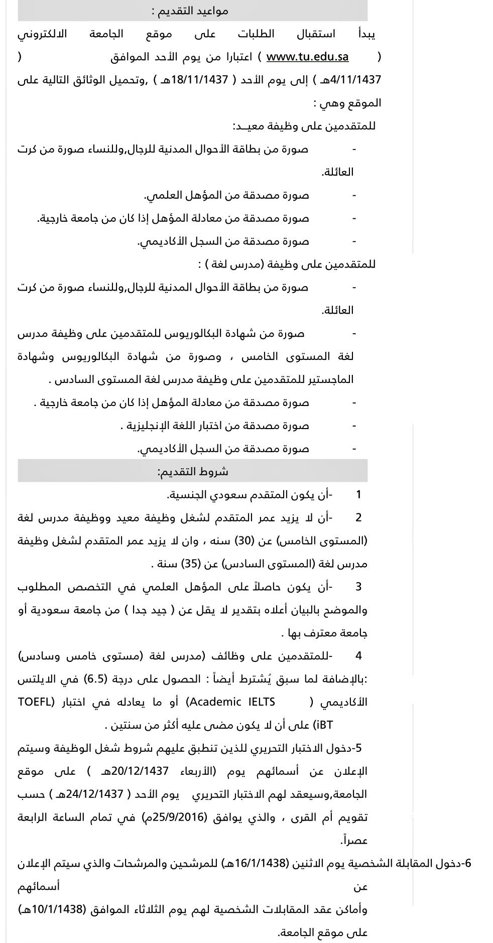 الوظيفة التخصص المطلوب للدراسة جهة. وأشارت جامعة الطائف إلى أنه سيتم الإعلان عن أسماء الذين تنطبق عليهم شروط شغل الوظيفة يوم الأربعاء 15 محرم 1439 على موقع الجامعة على أن يعقد لهم الاختبار التحريري في تمام الساعة الرابعة عصر ا يوم الاثنين 19 محرم 1439 حسب تقويم أم القرى الموافق التاسع من سبتمبر 2017 فيما سيتم. وأقرت جامعة الطائف العام الماضي خطوة تحفيزية جديدة لدعم وتشجيع التفوق الدراسي بعد أن أصدر مديرها الدكتور حسام بن عبدالوهاب زمان قرارا تنظيميا يقضي بترشيح الأوائل من خريجي وخريجات جميع كليات الجامعة تلقائيا في وظائف معيدين مع إتاحة الفرصة لبقية الخريجين. تعلن جامعة الطائف عن حاجتها لشغل وظائف معيد بكليات وفروع الجامعة في التخصصات التالية.