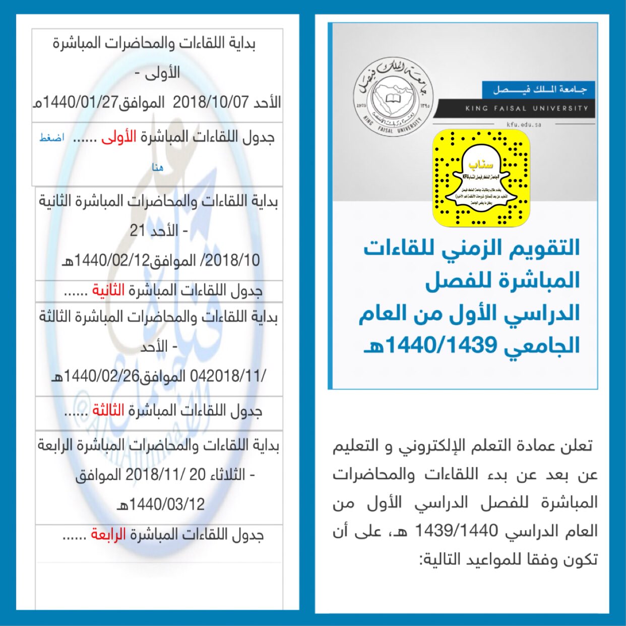 قناة علم الاجتماعkfu On Twitter المحاضرات المباشرة التقويم الزمني للقاءات المباشرة للفصل الدراسي الأول للعام الدراسي ١٤٣٩ ١٤٤٠ Https T Co Objyplsxyd جامعة الملك فيصل جامعة الملك فيصل انتساب Https T Co Gej5icmbpc