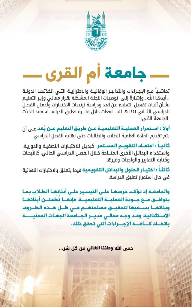 أم القرى تبدأ تطبيق أنظمة التعلم عن ب عد استجابة لقرار تعليق الدراسة المركز الإعلامي الإدارة العامة للاتصال المؤسسي جامعة أم القرى