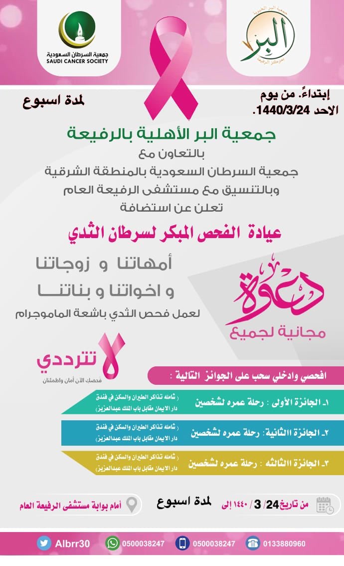 جمعية البر الأهلية بــ الرفيعة Na Twitteru الصمان مبادرة نسائية افحصي وادخلي على السحب إطلاق مبادرة الفحص المبكر عن سرطان الثدي بالتعاون مع جمعية السرطان السعودية بالمنطقة الشرقيه ومستشفى الرفيعه العام إبتداء من يوم الاحد القادم