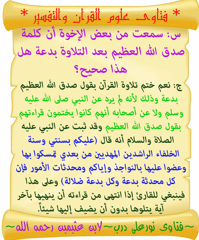 قول صدق الله العظيم بعد الانتهاء من قراءة القران بدعة منتدى الكفيل